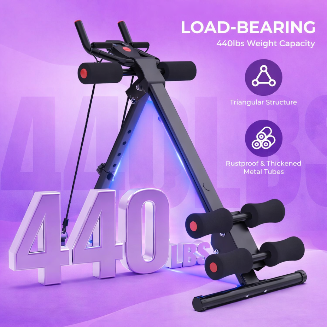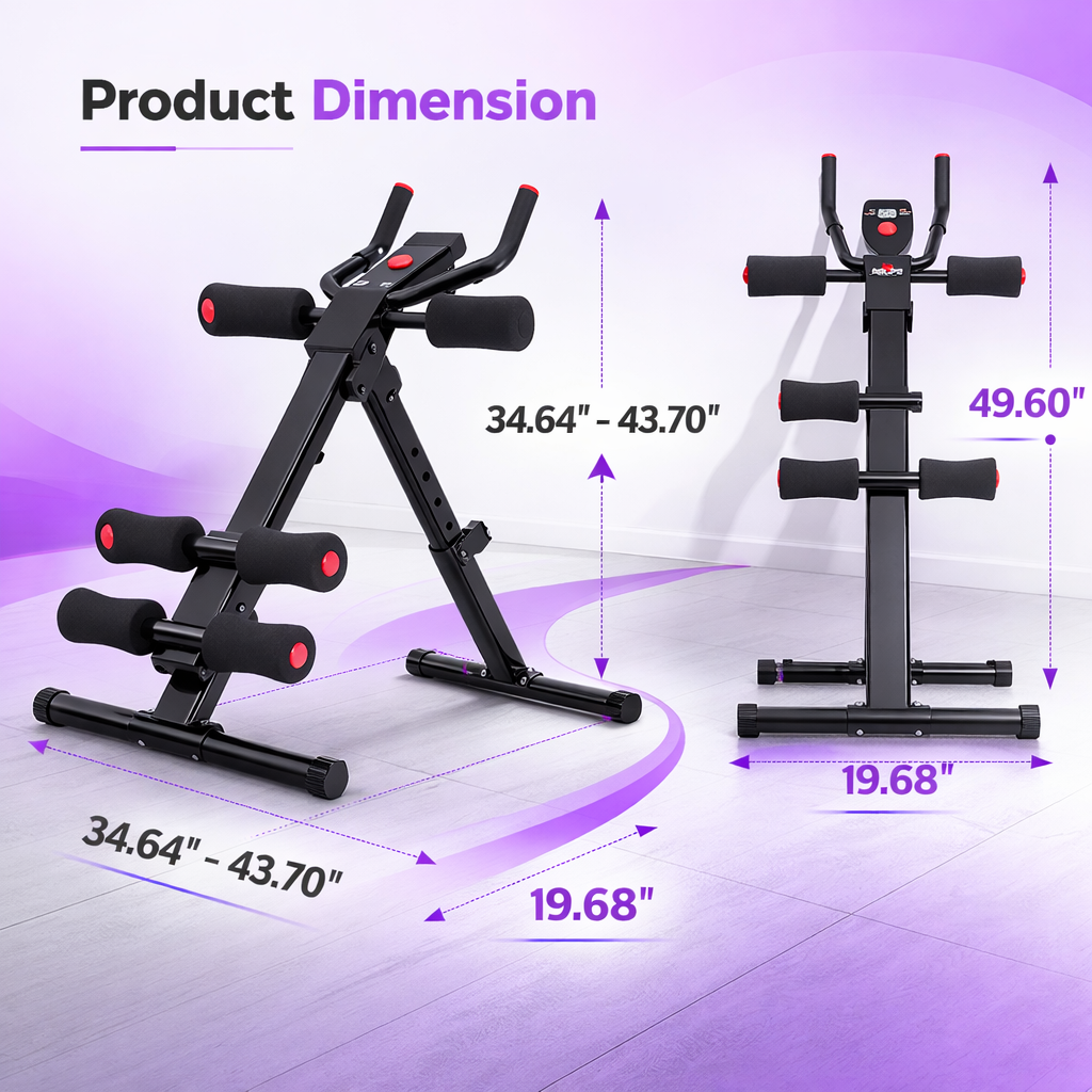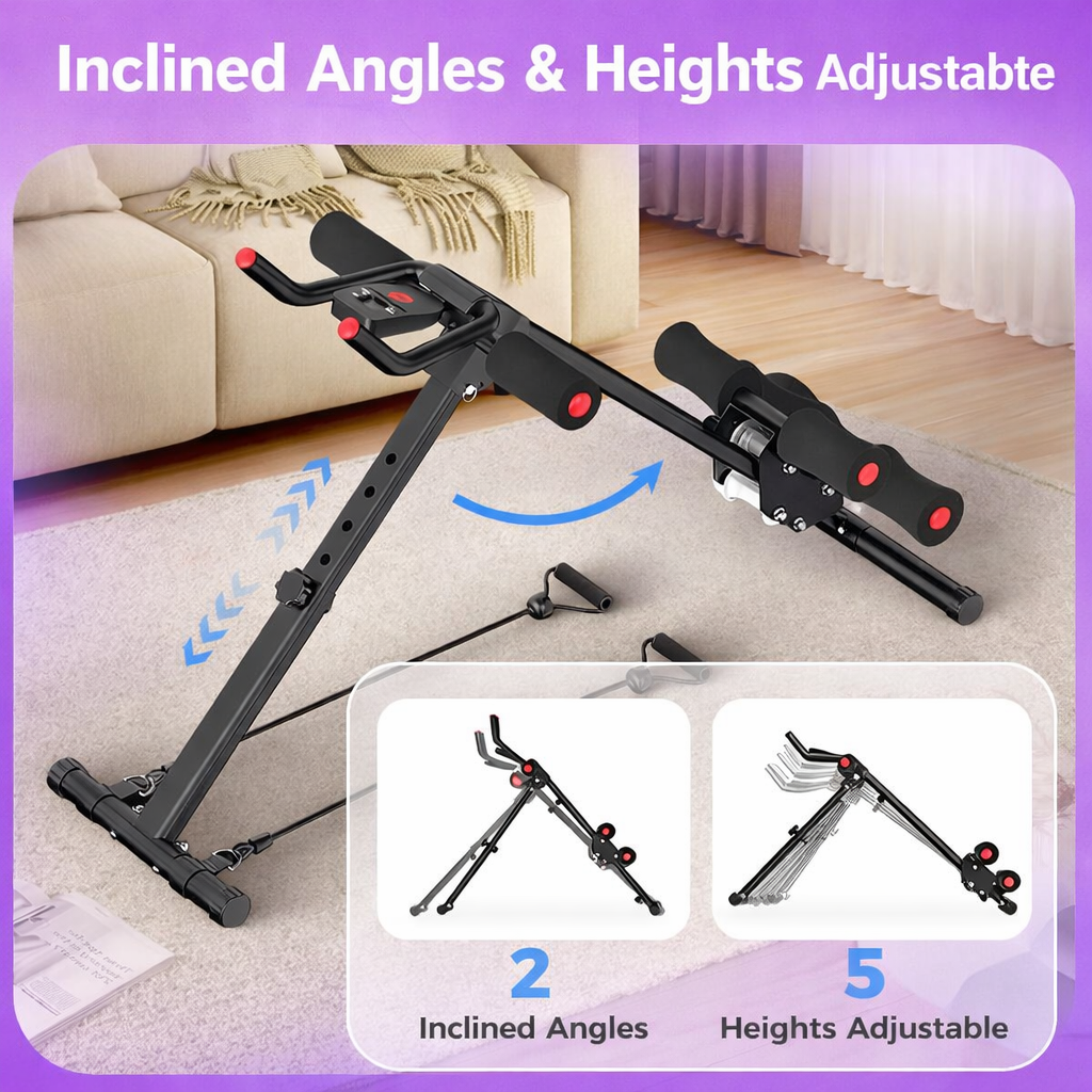 This compact adjustable ab trainer is a versatile home fitness machine designed to strengthen your core and support full-body workouts. Engineered with a reinforced steel frame for stability and durability, it supports high weight capacity while remaining compact enough for small spaces. With multiple height settings and incline levels, you can easily adjust the intensity to match your fitness level. Thick padded rollers enhance comfort, and the built-in LCD monitor tracks your reps and workout time, helping you stay consistent and motivated.